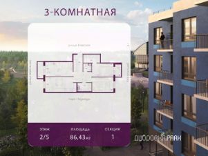 Продаётся 3- комнатная квартира площадью 86,43 кв.м. на 2 этаже 5-этажного дома в ЖК "Дубровка. Park". Номер квартиры 4.