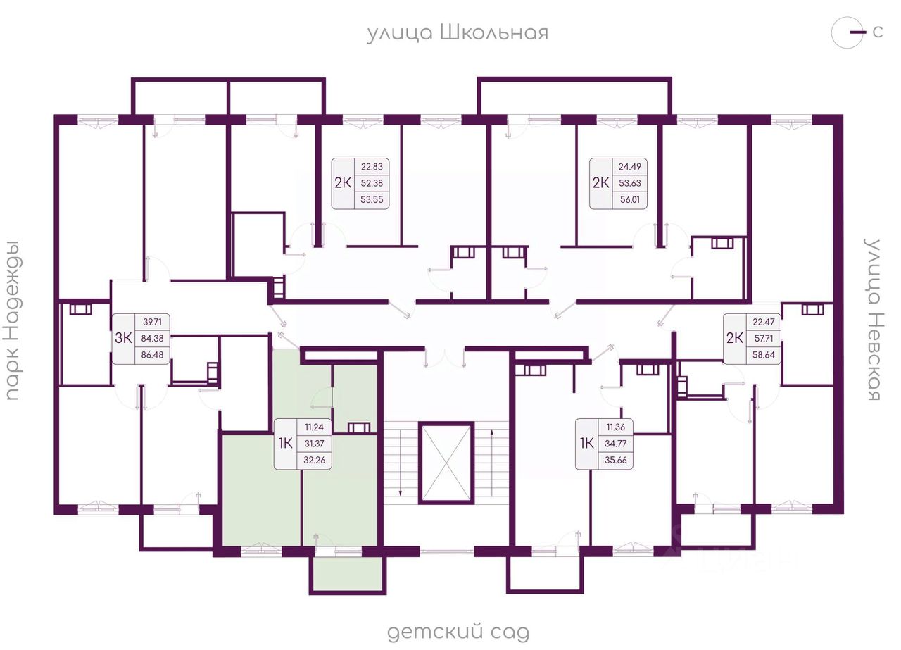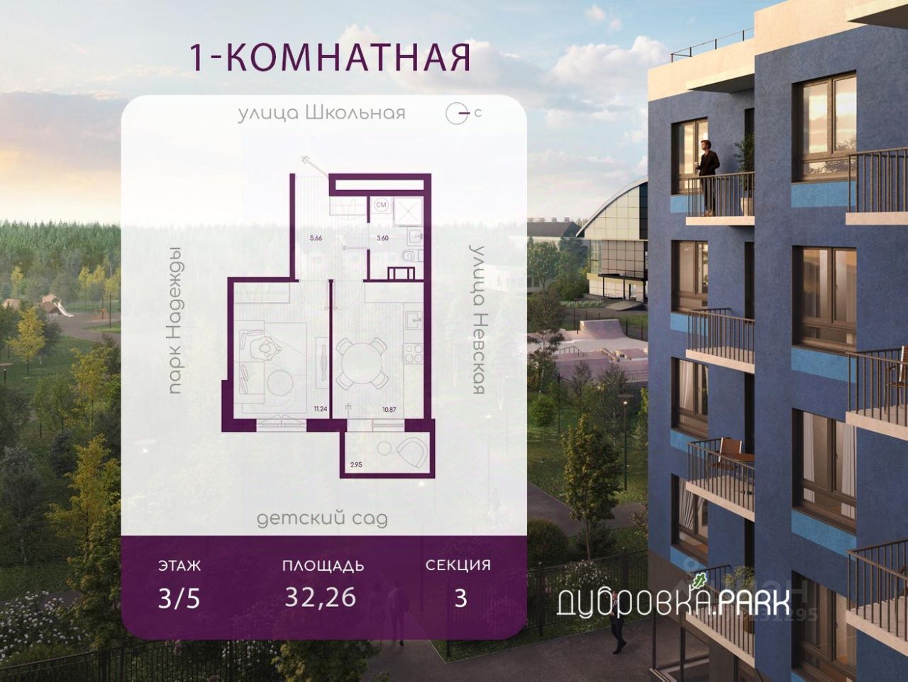 Продаётся 1- комнатная квартира площадью 32,26 кв.м. на 3 этаже 5-этажного дома в ЖК "Дубровка. Park". Номер квартиры 71.