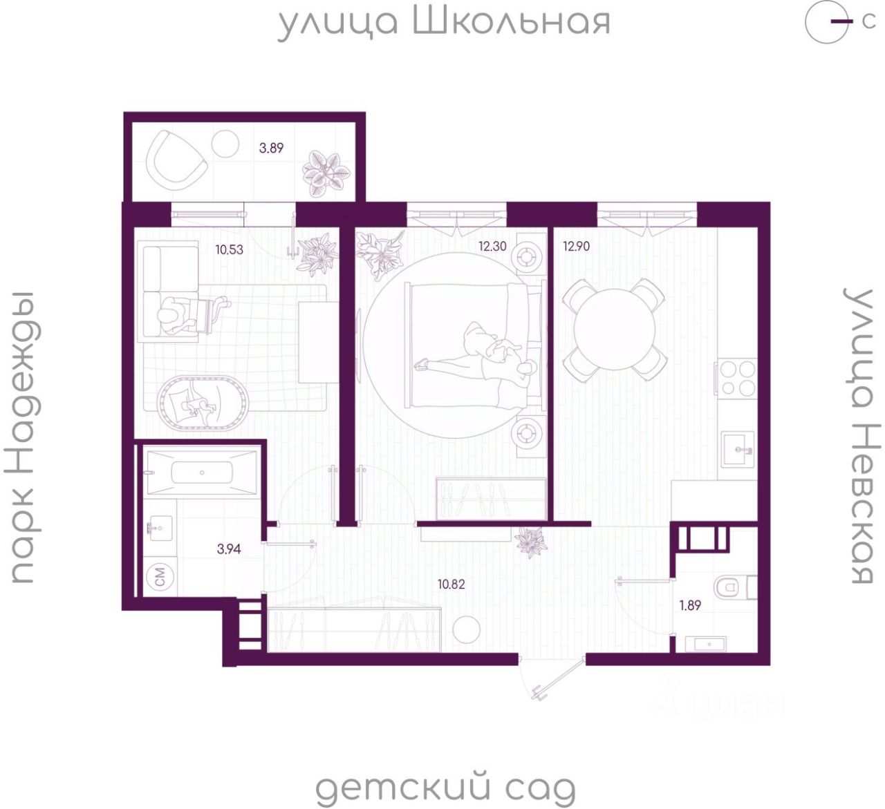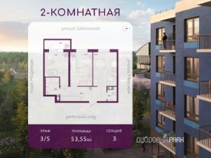 Продаётся 2- комнатная квартира площадью 53,55 кв.м. на 3 этаже 5-этажного дома в ЖК "Дубровка. Park". Номер квартиры 73.