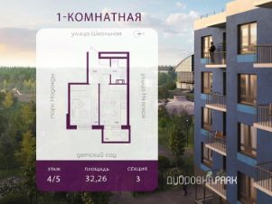 Продаётся 1- комнатная квартира площадью 32,26 кв.м. на 4 этаже 5-этажного дома в ЖК "Дубровка. Park". Номер квартиры 77.