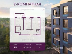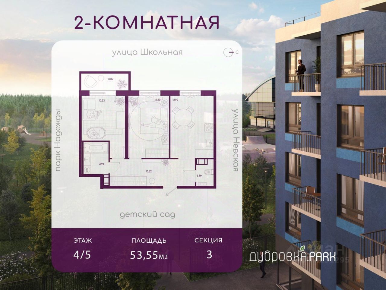Продаётся 2- комнатная квартира площадью 53,55 кв.м. на 4 этаже 5-этажного дома в ЖК "Дубровка. Park". Номер квартиры 79.