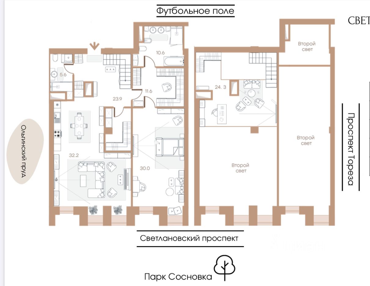 Продаётся просторная двухуровневая квартира от застройщикат в СПБ площадью 114,3 кв м на 6 этаже готового клубного дома "Светлановский 45". Высота потолков в квартире 4,5 метра. Недвижимость в Выборгском районе СПБ имеет предчистовую отделку и свободную планировку. В общественных зонах дома выполнен дизайнерский ремонт. Жизнь в этом доме в лучшем ЖК Выборгского района имеет множество удобств и привилегий, включая охраняемую территорию, парковку, консьерж-сервис, тренажерный зал, лаундж и спа-зону на крыше. Во дворе дома детский сад и китайско-английская гимназия.
