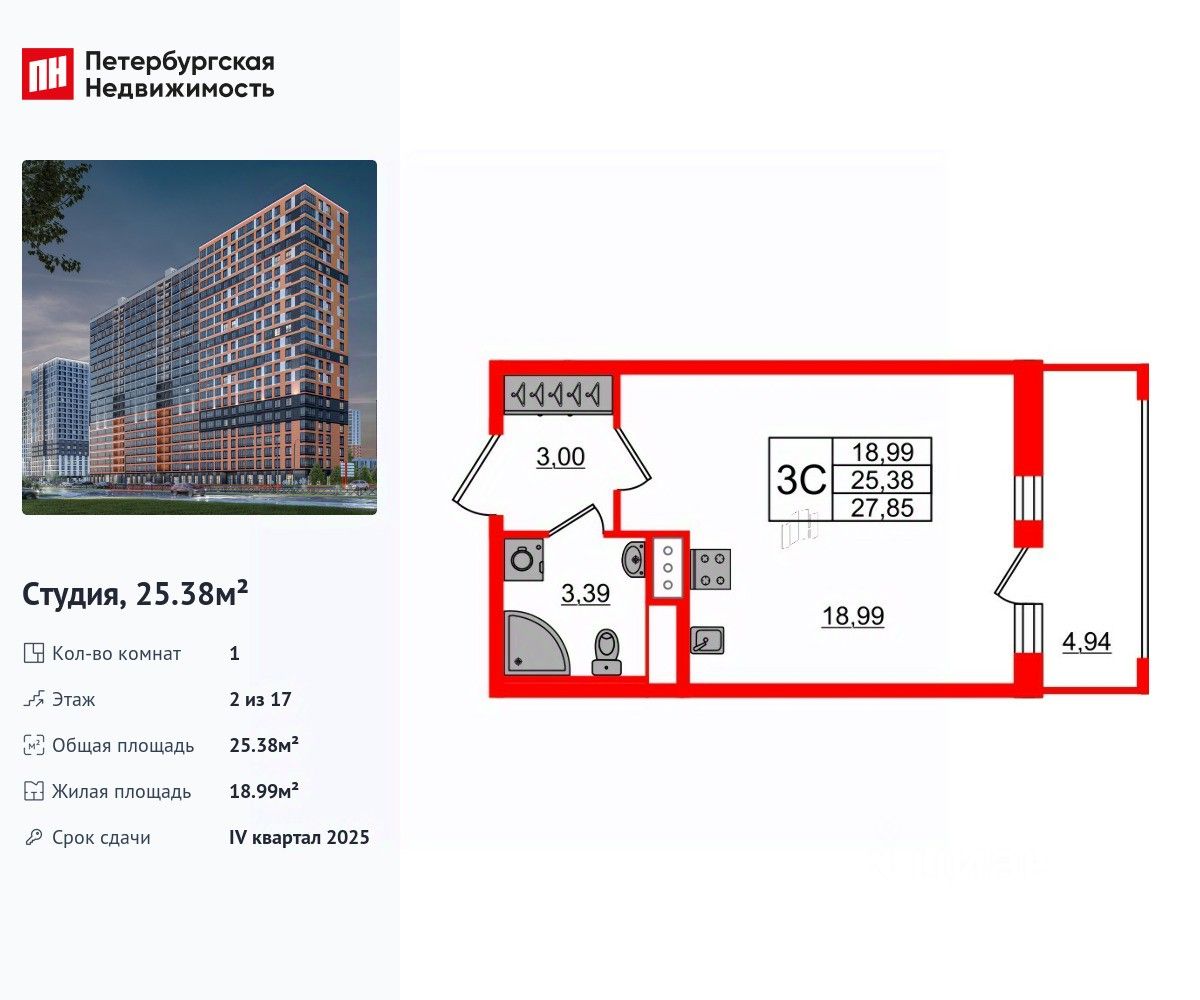 Удобная, классическая, функциональная европланировка, вместительная прихожая 3 м². Общая площадь студии - 25.38 м², жилая 18.99 м², высота потолка 2.77 м.