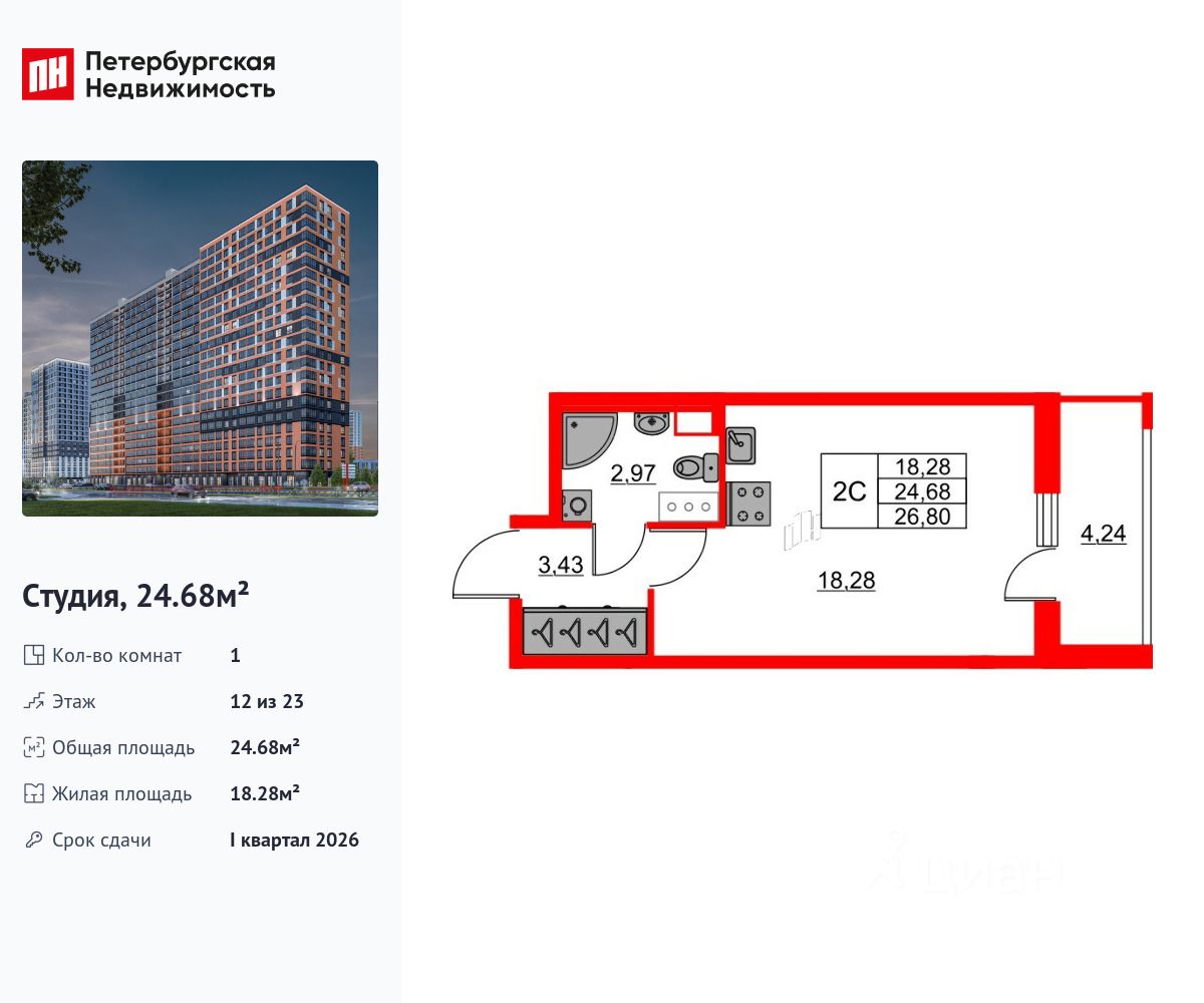 Удобная, классическая, функциональная европланировка, просторная прихожая 3.43 м². Общая площадь студии - 24.68 м², жилая 18.28 м², высота потолка 2.77 м.