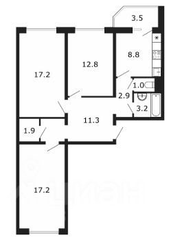 Квартира расположена на 10 этаже, общая площадь- 76,3м2, кухня-8,8 м2, комнаты: 17,2м2, 17,2 м2, 12,8м2, прихожая-11,3 м2, гардеробная-1,9м2, ванная- 3,2 м2, сан.узел- 1м2. Высота потолков - 2,7м. В квартире остается вся мебель и техника, установлен бойлер. Ремонт делали для себя. Продуманная двухсторонняя планировка.