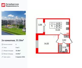 Удобная, классическая, функциональная европланировка, большая кухня-гостиная 14.54 м², вместительная прихожая 3.63 м². Общая площадь квартиры - 35.38 м², жилая 14.05 м², высота потолка 3.07 м.
