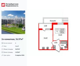 Удобная, классическая, функциональная европланировка, большая кухня-гостиная 15.97 м², вместительная прихожая 3.63 м². Общая площадь квартиры - 36.97 м², жилая 14.05 м², высота потолка 2.77 м.