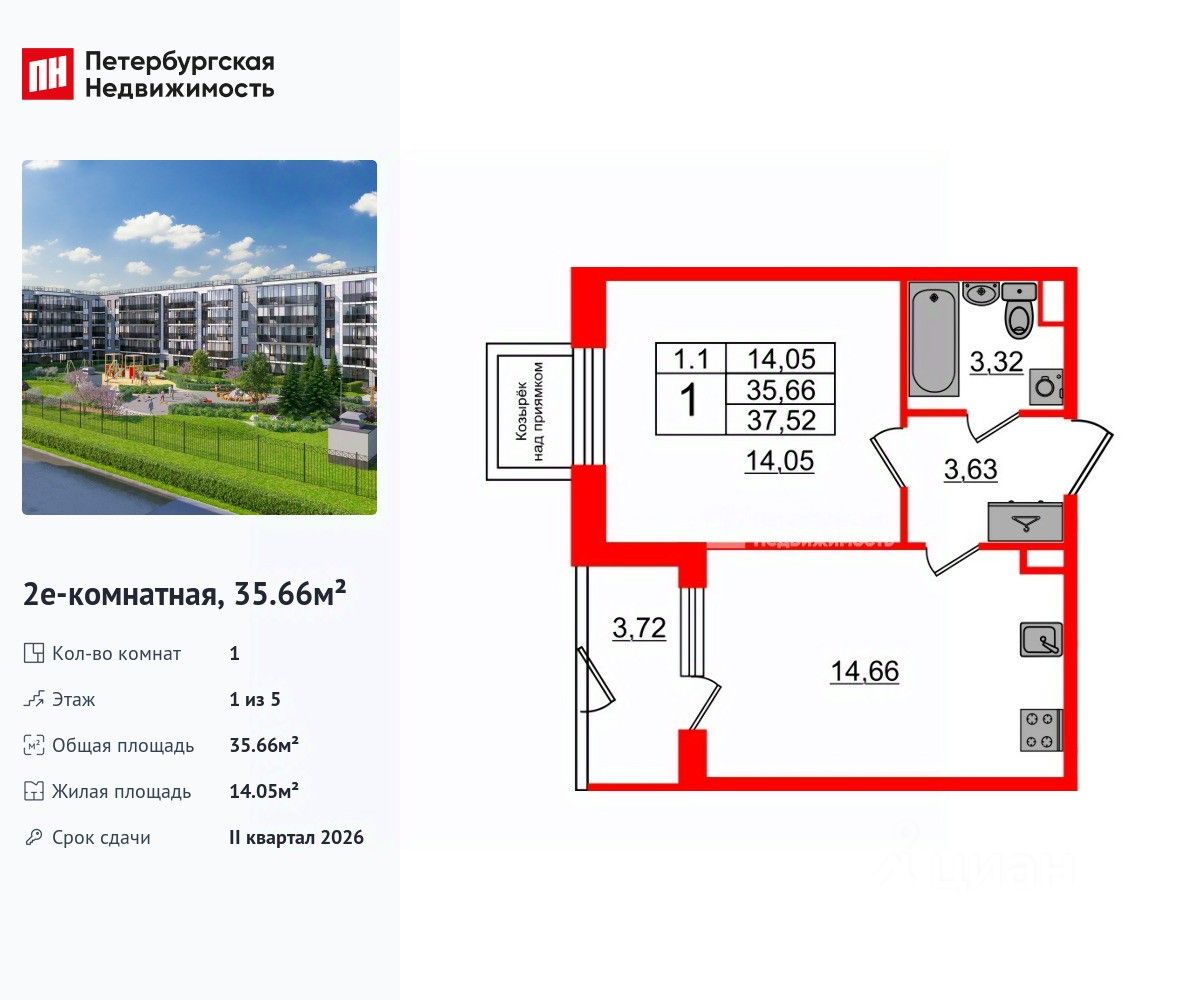 Удобная, классическая, функциональная европланировка, большая кухня-гостиная 14.66 м², вместительная прихожая 3.63 м². Общая площадь квартиры - 35.66 м², жилая 14.05 м², высота потолка 2.77 м.