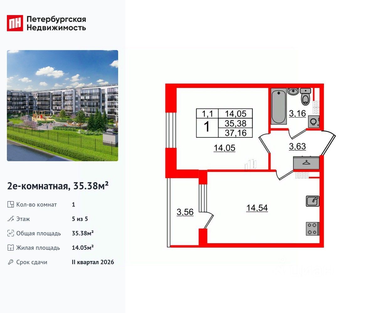 Удобная, классическая, функциональная европланировка, большая кухня-гостиная 14.54 м², вместительная прихожая 3.63 м². Общая площадь квартиры - 35.38 м², жилая 14.05 м², высота потолка 3.07 м.