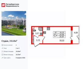 Удобная, классическая, функциональная европланировка, вместительная прихожая 3.1 м². Общая площадь студии - 24.64 м², жилая 18.33 м², высота потолка 2.77 м.