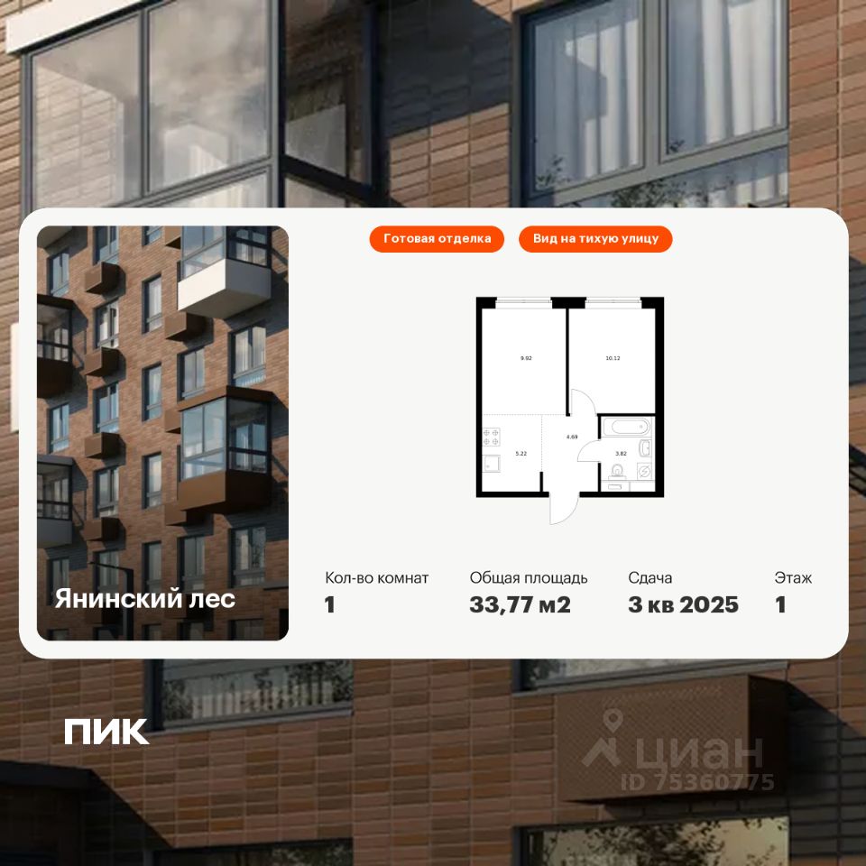 Продаётся 1-комн. квартира площадью 33,77 кв.м на 1 этаже 15 этажного дома (Корпус 9, Секция 1) проекта ПИК Янинский лес. Светлый просторный подъезд на уровне земли, функциональная планировка, большие окна, c отделкой.