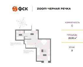 Цена со специальной скидкой в прямой продаже от застройщика — только в этом месяце. Апартамент-студия в комплексе класса бизнес-лайт Zoom Чёрная Речка на 9-м этаже. Общая площадь 28,99. Предчистовая отделка.
