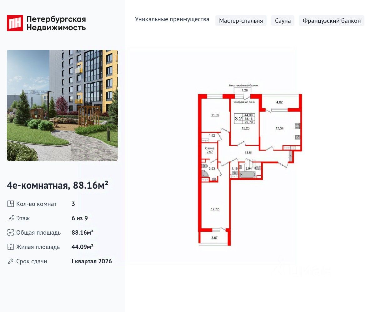 Уникальная, функциональная европланировка, большая кухня-гостиная 17.34 м², просторная прихожая 13.61 м². Общая площадь квартиры - 88.16 м², жилая 44.09 м², высота потолка 2.77 м.