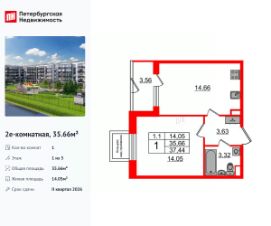 Удобная, классическая, функциональная европланировка, большая кухня-гостиная 14.66 м², вместительная прихожая 3.63 м². Общая площадь квартиры - 35.66 м², жилая 14.05 м², высота потолка 2.77 м.