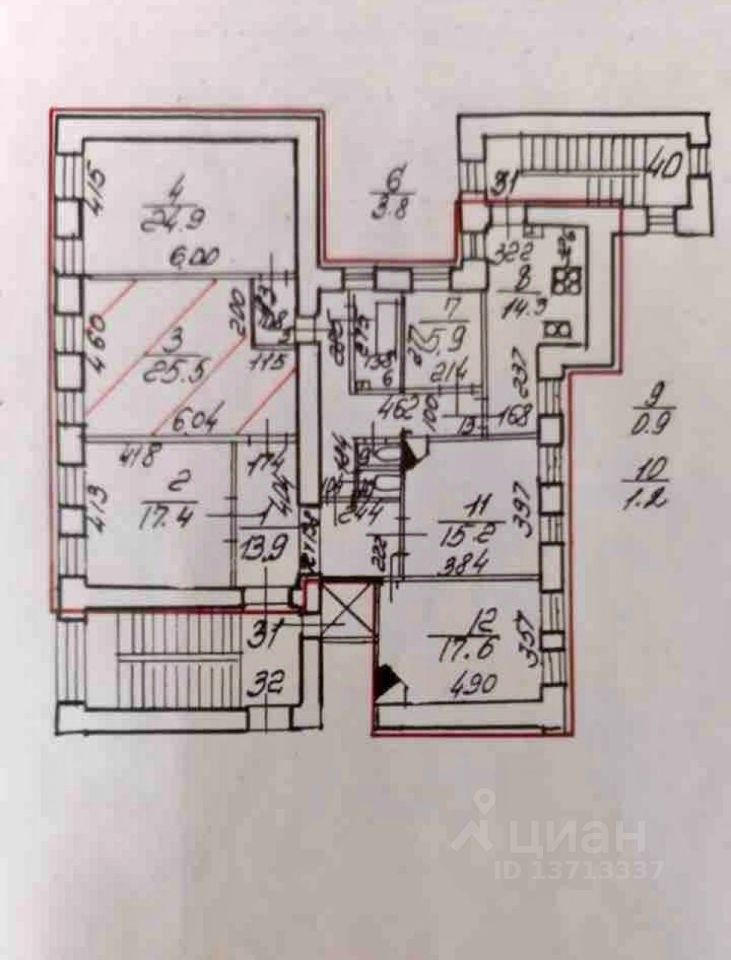Просторная, светлая комната 25,5м2 в шестикомнатной коммунальной квартире общей площадью 151,8м2, расположенная на шестом этаже кирпичного дома 1914 года постройки