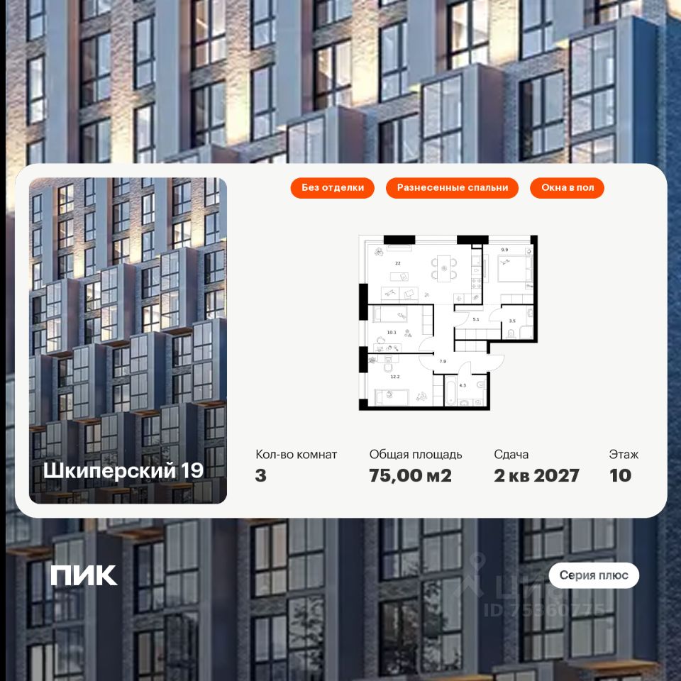 Продаётся 3-комн. квартира площадью 75 кв.м на 10 этаже 12 этажного дома (Корпус 2, Секция 5) проекта ПИК Шкиперский 19. Светлый просторный подъезд на уровне земли, функциональная планировка, большие окна, без отделки.