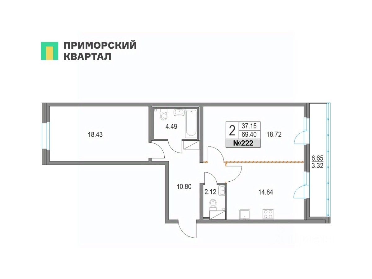 Продается 2 - комнатная квартира общей площадью 69.10 кв.м., на 4 этаже в построенном и заселенном корпусе 40 (год сдачи: 2024 г.)