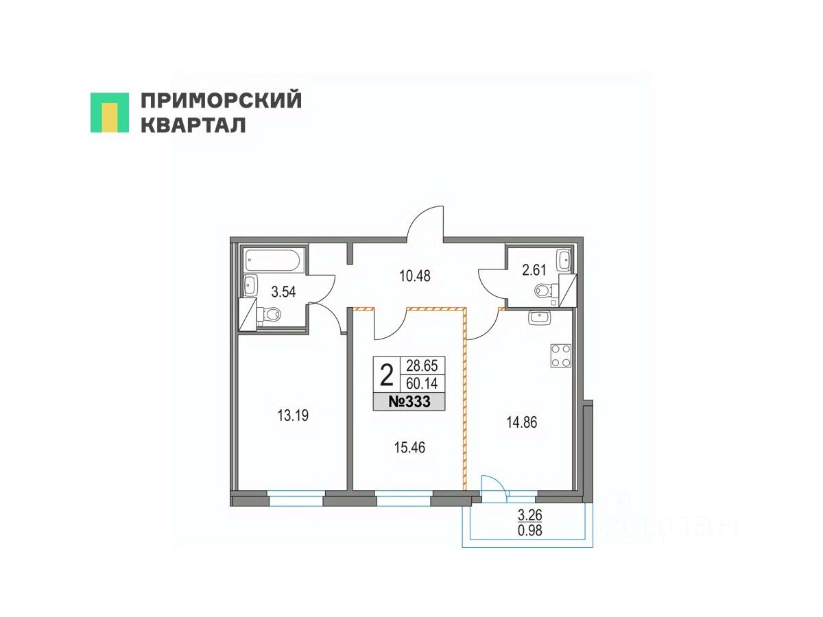 Продается 2 - комнатная квартира общей площадью 60.14 кв.м., на 6 этаже в построенном и заселенном корпусе 42 (год сдачи: 2024 г.)