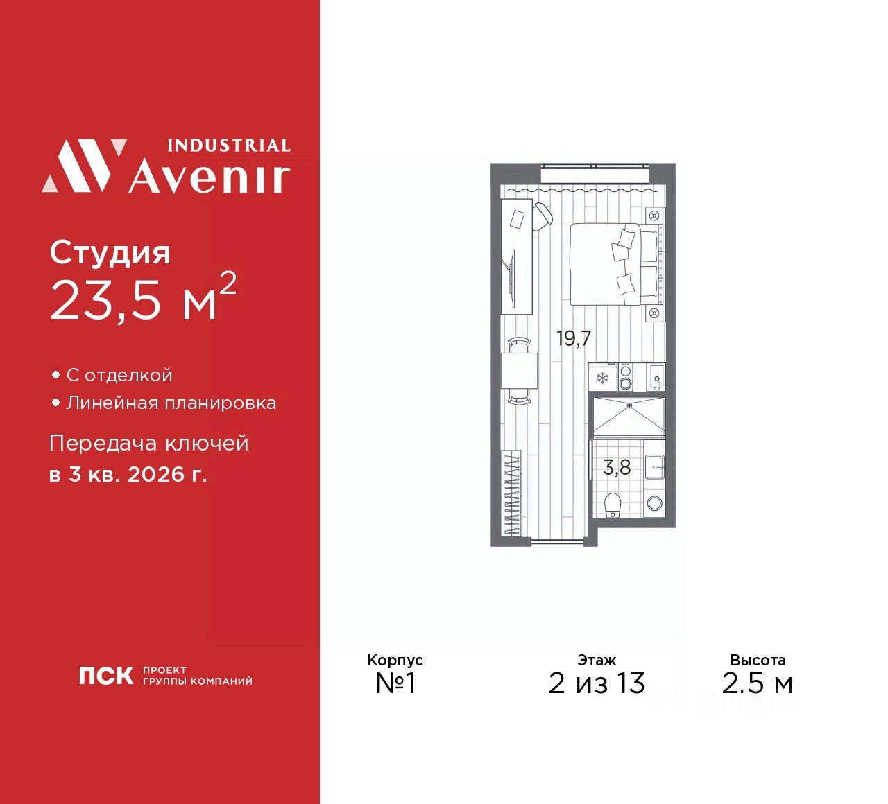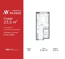 Однокомнатные апартаменты-студия с отделкой в ЖК "Industrial AVENIR" на 2 этаже. Общая площадь: 23.5 кв.м., площадь гостиной 19.7 кв.м., из которых 5 кв.м. выделено под кухонную зону. Все окна выходят на одну сторону. В апартаментах один совмещенный санузел. Высота потолков 2.5 м.