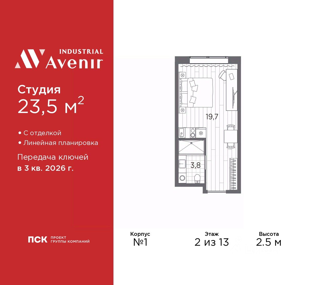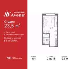 Просторные 1-комн. апартаменты-студия с отделкой в ЖК "Industrial AVENIR" на 2 этаже. Общая площадь: 23.5 кв.м., площадь гостиной 19.7 кв.м., из которых 5 кв.м. выделено под кухонную зону. Все окна выходят на одну сторону. В апартаментах один совмещенный санузел. Высота потолков 2.5 м.