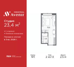 Однокомнатные апартаменты-студия с отделкой в ЖК "Industrial AVENIR" на 2 этаже. Общая площадь: 23.4 кв.м., площадь гостиной 19.6 кв.м., из которых 5 кв.м. выделено под кухонную зону. Все окна выходят на одну сторону. В апартаментах один совмещенный санузел. Высота потолков 2.5 м.
