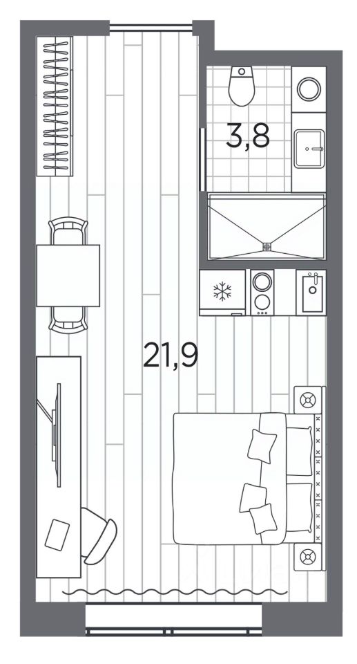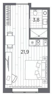 1-комн. апартаменты-студия с отделкой в ЖК "Industrial AVENIR" на 2 этаже. Общая площадь: 25.7 кв.м., площадь гостиной 21.9 кв.м., из которых 5 кв.м. выделено под кухонную зону. Все окна выходят на одну сторону. В апартаментах один совмещенный санузел. Высота потолков 2.5 м.
