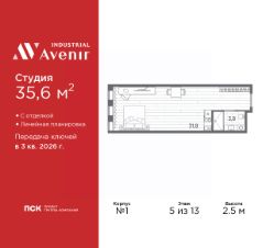 1-комн. апартаменты-студия с отделкой в ЖК "Industrial AVENIR" на 5 этаже. Общая площадь: 35.6 кв.м., площадь гостиной 31.8 кв.м., из которых 5 кв.м. выделено под кухонную зону. Все окна выходят на одну сторону. В апартаментах один совмещенный санузел. Высота потолков 2.5 м.