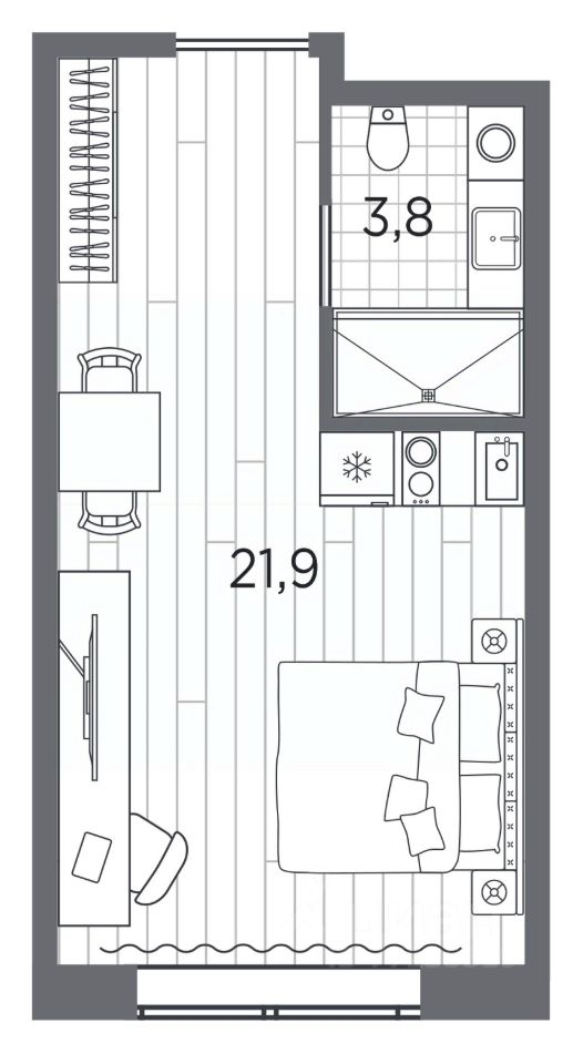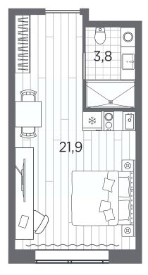 1-комн. апартаменты-студия с отделкой в ЖК "Industrial AVENIR" на 5 этаже. Общая площадь: 25.7 кв.м., площадь гостиной 21.9 кв.м., из которых 5 кв.м. выделено под кухонную зону. Все окна выходят на одну сторону. В апартаментах один совмещенный санузел. Высота потолков 2.5 м.