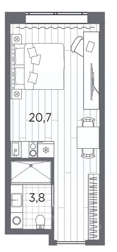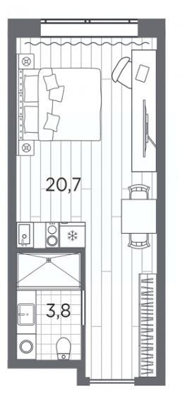 Продаются 1-комн. апартаменты-студия с отделкой в ЖК "Industrial AVENIR" на 7 этаже. Общая площадь: 24.5 кв.м., площадь гостиной 20.7 кв.м., из которых 5 кв.м. выделено под кухонную зону. Все окна выходят на одну сторону. В апартаментах один совмещенный санузел. Высота потолков 2.5 м.