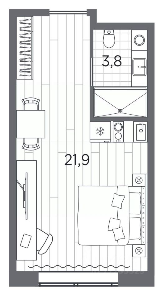 1-комн. апартаменты-студия от застройщика с отделкой в ЖК "Industrial AVENIR" на 7 этаже. Общая площадь: 25.7 кв.м., площадь гостиной 21.9 кв.м., из которых 5 кв.м. выделено под кухонную зону. Все окна выходят на одну сторону. В апартаментах один совмещенный санузел. Высота потолков 2.5 м.