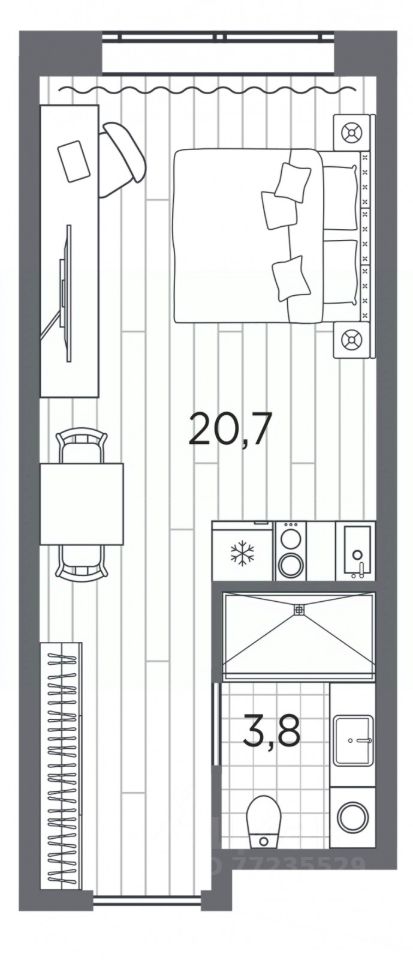 Продаются 1-комн. апартаменты-студия с отделкой в ЖК "Industrial AVENIR" на 12 этаже. Общая площадь: 24.5 кв.м., площадь гостиной 20.7 кв.м., из которых 5 кв.м. выделено под кухонную зону. Все окна выходят на одну сторону. В апартаментах один совмещенный санузел. Высота потолков 2.5 м.