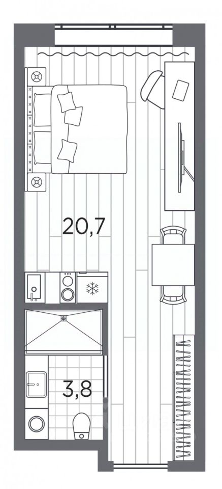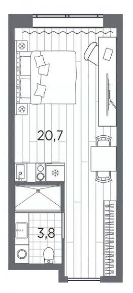 Просторные 1-комн. апартаменты-студия с отделкой в ЖК "Industrial AVENIR" на 12 этаже. Общая площадь: 24.5 кв.м., площадь гостиной 20.7 кв.м., из которых 5 кв.м. выделено под кухонную зону. Все окна выходят на одну сторону. В апартаментах один совмещенный санузел. Высота потолков 2.5 м.