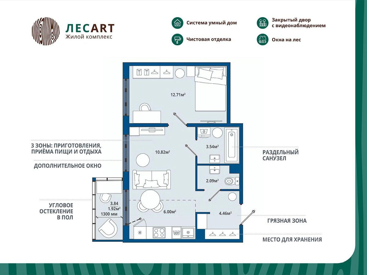 Продаётся 1-комнатная квартира 312, общей площадью 41.54 кв.м., на 11. Дом комфорт-класса, 12 этажей, в окружении леса и малоэтажной застройки. Проект с умным домом. Передача квартир в сентябре 2026г.