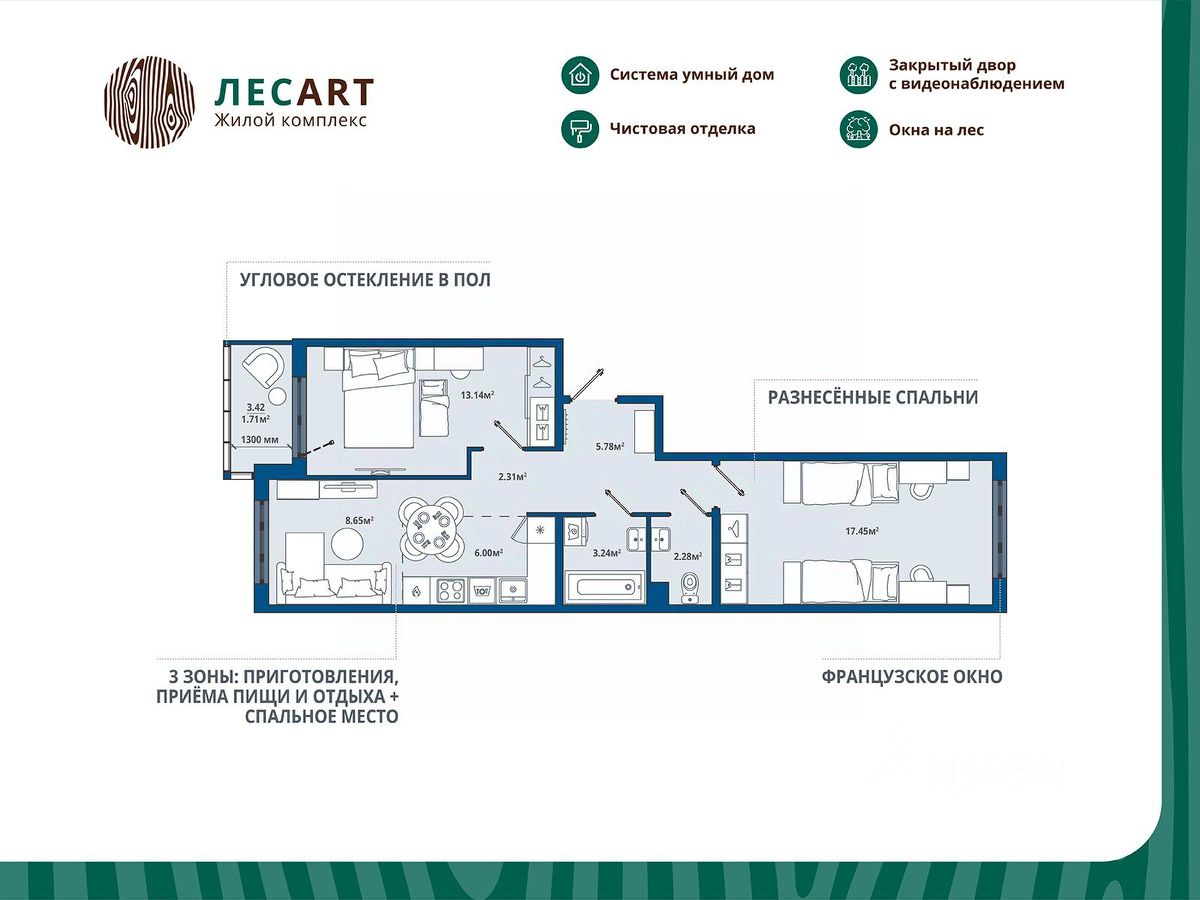 Продаётся 2-комнатная квартира 311, общей площадью 60.56 кв.м., на 11. Дом комфорт-класса, 12 этажей, в окружении леса и малоэтажной застройки. Проект с умным домом. Передача квартир в сентябре 2026г.