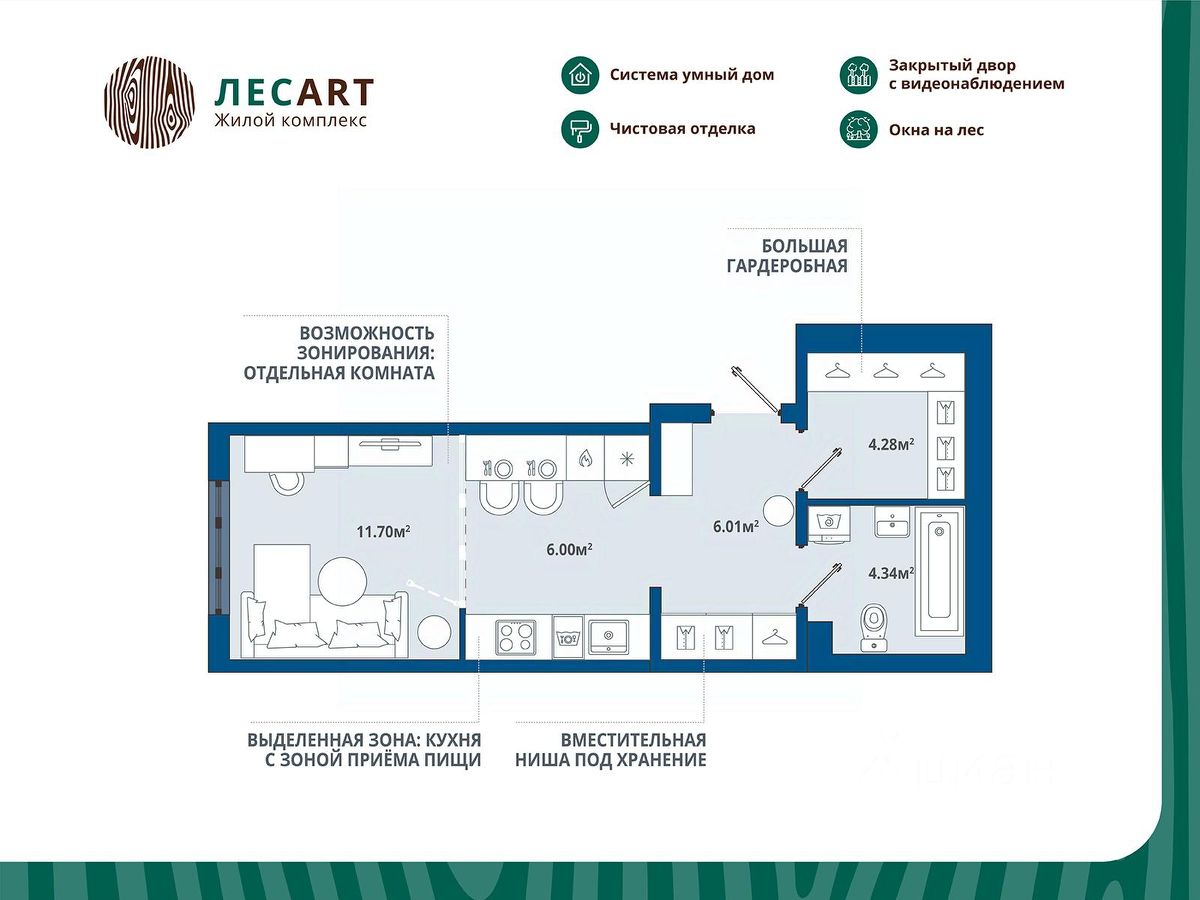 Продаётся 1-комнатная квартира 179, общей площадью 32.33 кв.м., на 1. Дом комфорт-класса, 12 этажей, в окружении леса и малоэтажной застройки. Проект с умным домом. Передача квартир в сентябре 2026г.