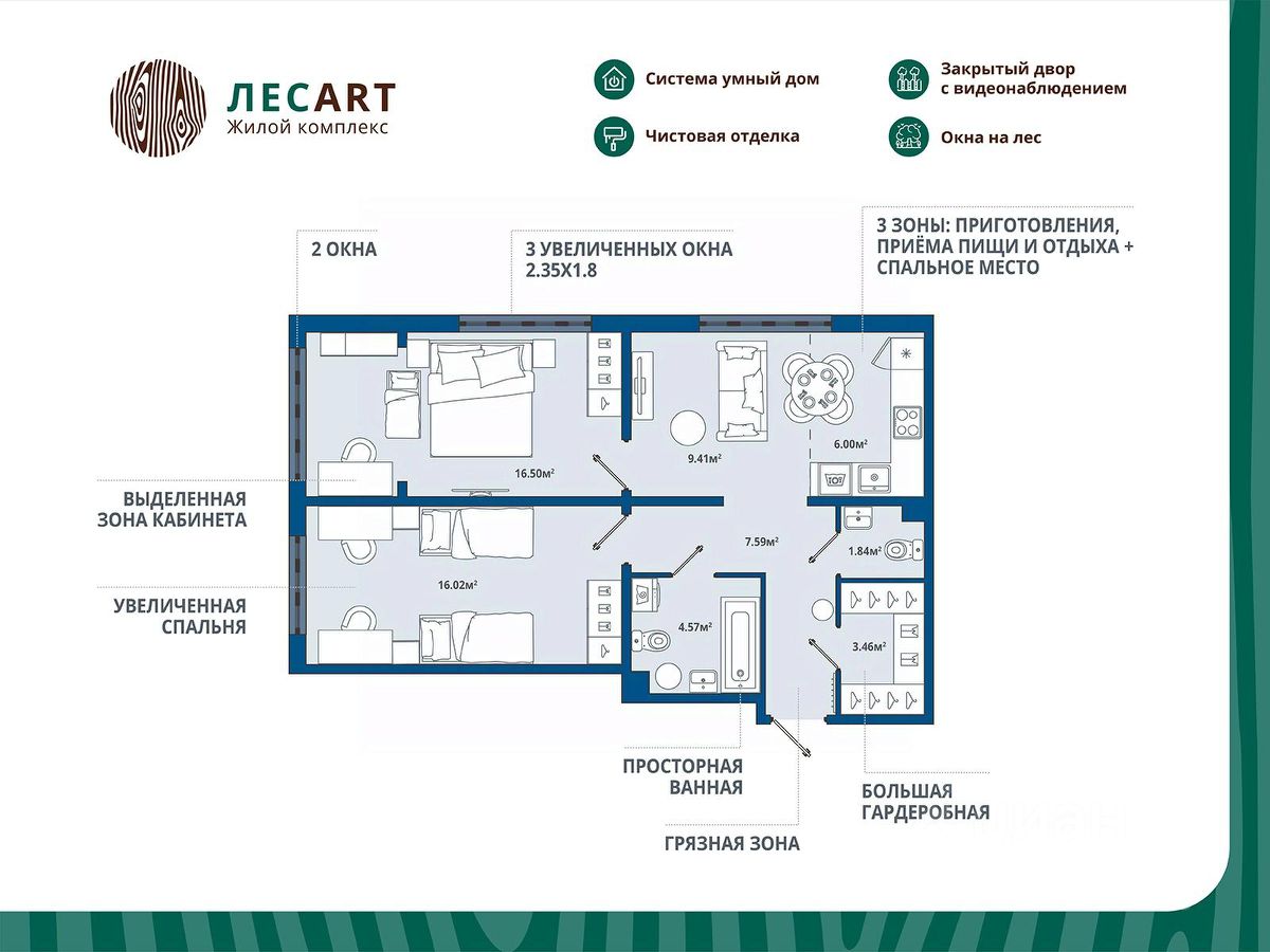 Дворы закрыты от машин, что обеспечивает безопасность детей и взрослых. Для семей с детьми особенно удобно наличие детского сада и школы прямо во дворе комплекса.