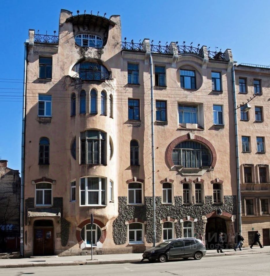 6-ти этажный дом был построен в 1903-ом году. Его яркий и уникальный фасад решён в стиле `Модерн`.Это единственный в городе доходный дом, где приемы свободной криволинейной стилизации полностью перенесены с отделки или декора (которого здесь практически нет) на основные функционально-конструктивные узлы и элементы`.