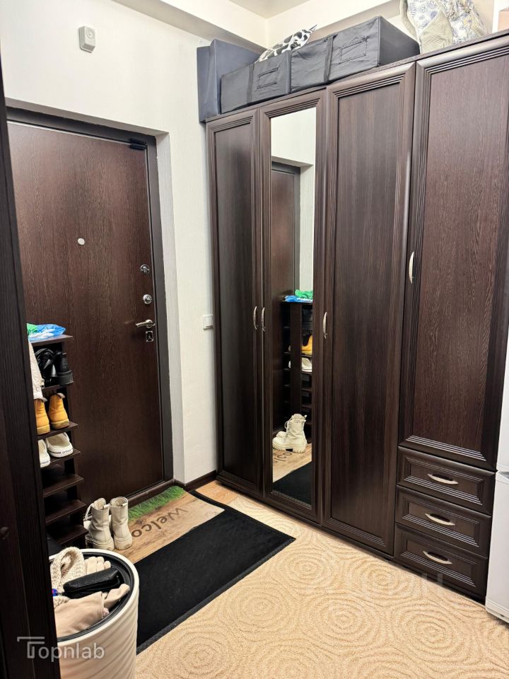 В квартире большая прихожая, в которой установлен вместительный шкаф, холодильник, вешалка, обувница, тумба.