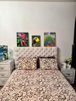 Установлен кухонный гарнитур. Островок с тумбой в основании. Большая кровать в комплекте с тумбочкой и комодом.