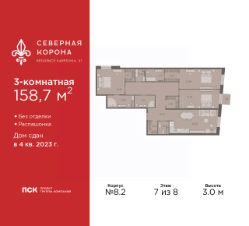 3-комн. квартира от застройщика в ЖК "Северная корона" на 7 этаже. Квартира без отделки, после получения ключей можно делать ремонт. Общая площадь: 158.7 кв.м., жилая: 59.51 кв.м., площадь просторной кухни-столовой: 28.33 кв.м. Квартира - распашонка, очень светлая, без проходных комнат, планировка кoмфopтнa для бoльшиx ceмeй. В квартире один балкон, три совмещенных и один раздельный санузел. Высота потолков 3.0 м.