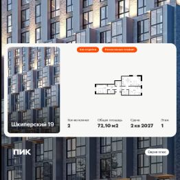 Продаётся 2-комн. квартира площадью 72,1 кв.м на 1 этаже 12 этажного дома (Корпус 2, Секция 4) проекта ПИК Шкиперский 19. Светлый просторный подъезд на уровне земли, функциональная планировка, большие окна, без отделки.