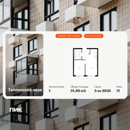 Продаётся 1-комн. квартира площадью 31,8 кв.м на 11 этаже 12 этажного дома (Корпус 3.1, Секция 3) проекта ПИК Таллинский парк. Светлый просторный подъезд на уровне земли, функциональная планировка, большие окна, предчистовая отделка.