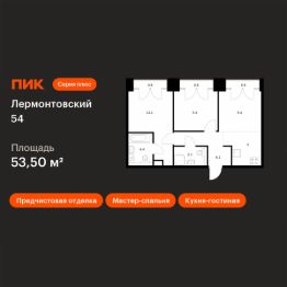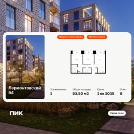 Продаётся 2-комн. квартира площадью 53,5 кв.м на 9 этаже 9 этажного дома (Корпус 1, Секция 6) проекта ПИК Лермонтовский 54. Светлый просторный подъезд на уровне земли, функциональная планировка, большие окна, предчистовая отделка.