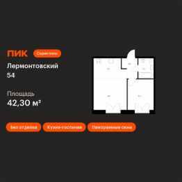 Продаётся 1-комн. квартира площадью 42,3 кв.м на 6 этаже 7 этажного дома (Корпус 2.2, Секция 8) проекта ПИК Лермонтовский 54. Светлый просторный подъезд на уровне земли, функциональная планировка, большие окна, без отделки.