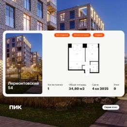 Продаётся 1-комн. квартира площадью 34,8 кв.м на 9 этаже 9 этажного дома (Корпус 2.2, Секция 13) проекта ПИК Лермонтовский 54. Светлый просторный подъезд на уровне земли, функциональная планировка, большие окна, без отделки.