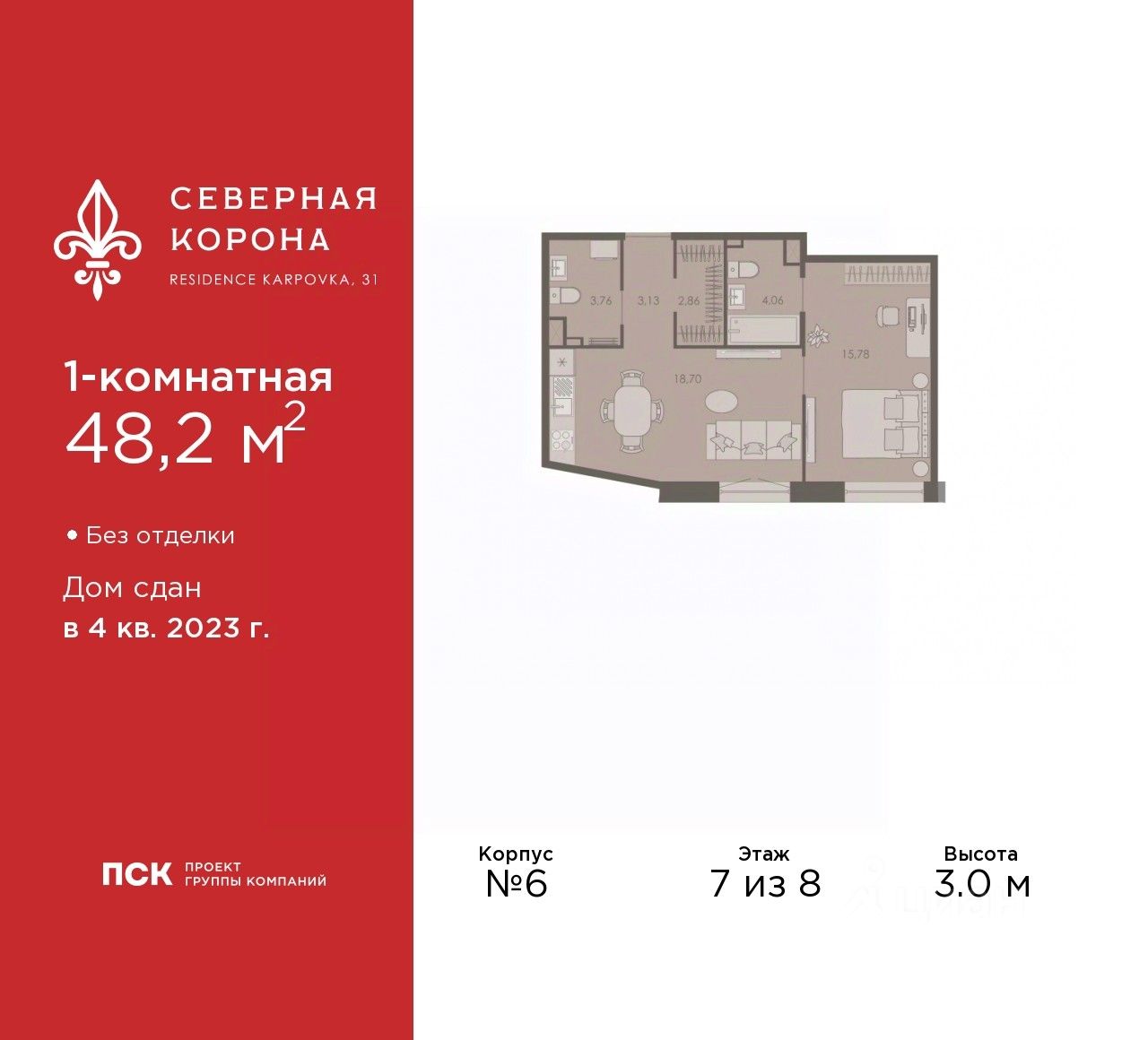 Однокомнатная квартира в ЖК "Северная корона" на 7 этаже. Квартира без отделки, после оформления собственности можно делать ремонт. Общая площадь: 48.2 кв.м., жилая: 15.78 кв.м., площадь просторной кухни-столовой: 18.7 кв.м. Все окна выходят на одну сторону. В квартире один совмещенный и один раздельный санузел. Высота потолков 3.0 м.