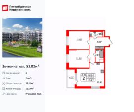 Удобная, классическая, функциональная европланировка, большая кухня-гостиная 17.4 м², просторная прихожая 8.8 м². Общая площадь квартиры - 53.02 м², жилая 22.04 м², высота потолка 2.77 м.