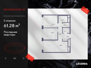 2-комн. квартира от застройщика с предчистовой отделкой в ЖК "Лисичанская, 22" на 6 этаже. Общая площадь: 61.28 кв.м., жилая: 24.04 кв.м., площадь просторной кухни-столовой: 19.67 кв.м. Комнаты изолированные, все окна выходят на одну сторону. В квартире один балкон, один раздельный санузел. Высота потолков 2.7 м.