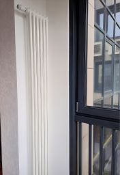Облицовка стен-декоративная штукатурка белого цвета  .  Настенные переключатели  на стеклянной основе  черного цвета на контрасте со стенами (  производство  Германия )   Облицовка пола- керамическая доска с сучками медового цвета (Мarrazi)     Система теплый пол  во всех комнатах   Натяжные потолки  с черными светильниками в стиле модерн