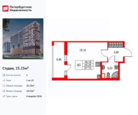 Удобная, классическая, функциональная европланировка, просторная прихожая 3.9 м². Общая площадь студии - 25.25 м², жилая 18.12 м², высота потолка 2.77 м.